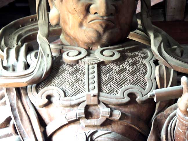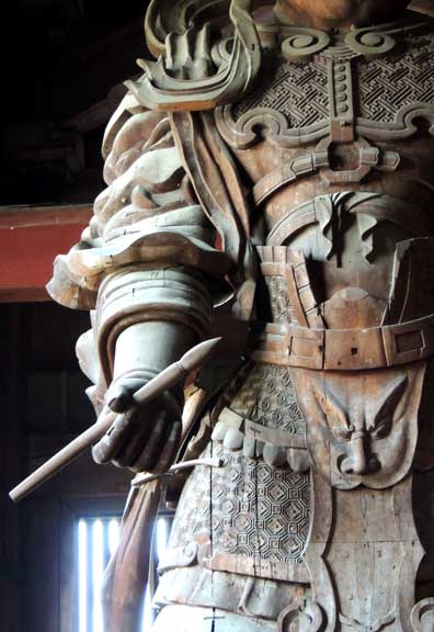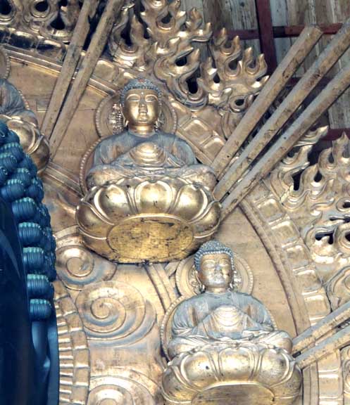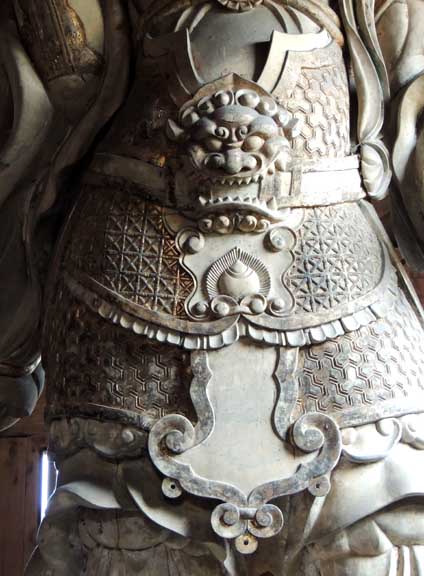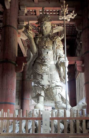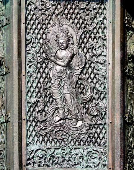 ![]() Great Buddha Hall - Tokyo and doors ![]() Great Buddha Hall - doors ![]() Great Buddha Hall - doors ![]() Great Buddha Hall. Todai-ji Daibutsu, or Great Buddha statue, Japan's largest bronze statue of the Buddha - 49 feet in height. ![]() Great Buddha Hall ![]() Great Buddha Hall. The statue of the Great Buddha is monumental. The bronze figure was modeled in eight stages, and its construction took three years. The statue is about 49 feet high and weighs 500 tons. The original statue was covered in gold leaf. Over the years, earthquakes and fires have damaged the statue, but it has always been restored. ![]() Great Buddha Hall - ceiling ![]() Great Buddha Hall. The Buddha is seated with the palm of his right hand extended forward. This is one of the main five gestures of the hands in Buddha statues and means "fear not" and “conversion of jealousy and envy into all-accomplishing wisdom.” ![]() Great Buddha Hall. The Daibutsu is made of copper and bronze, weighs 250 tons and stands 30 meters tall. His intricate hairstyle is made of 966 bronze balls. In early August, dozens of young monks neatly dressed in white climb on the Buddha or hang from ropes tied to the ceiling to dust and wipe the huge statue using colorful dusters. ![]() Great Buddha Hall ![]() Great Buddha Hall - Lotus plant ![]() Great Buddha Hall - Lotus plant ... Note butterflies: next illustration below: ![]() Great Buddha Hall - Butterfly ![]() Great Buddha Hall ![]() Great Buddha Hall - Eggs and flowers, examples of daily offerings ![]() ![]() Great Buddha Hall - Lotus ![]() Great Buddha Hall ![]() Great Buddha Hall - Note bronze behind the statue: next illustration below: ![]() Great Buddha Hall - behind the Buddha statue ![]() Komokuten, one of the pair of Guardians of the Four Directions (west). Four details below: ![]() Detail - Komokuten, one of the pair of Guardians of the Four Directions ![]() Detail - Komokuten, one of the pair of Guardians of the Four Directions ![]() Detail - Komokuten, one of the pair of Guardians of the Four Directions ![]() Detail - Komokuten, one of the pair of Guardians of the Four Directions ![]() ![]() Tamonten/Bishamonten, Guardian of the North, one of the Shitennō or Guardians of the Four Directions. Tamonten and Kōmokuten (Guardian of the West) are the only two Shitennō depicted in the Daibutsuden. ![]() Detail - Tamonten/Bishamonten, Guardian of the North ![]() Detail - Tamonten/Bishamonten, Guardian of the North ![]() Avenue of the Lanterns ![]() Avenue of the Lanterns ![]() Barrels of sake offerings wrapped in straw |