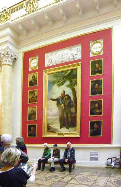 | War Gallery of 1812, Winter Palace "The War Gallery of 1812 was created in 1826 to the deign of Carlo Rossi to commemorate Russia's victory over Napoleonic France. Its walls carry 332 portraits of generals who fought in the war of 1812 and the foreign campaign of 1813-14. They were painted by the English artist George Dawe with the assistance of Wilhelm Golike and Alexander Poliakov." - Hermitage Official Website ![]() Large painting: Equestrian portrait of Alexander I (Wikipedia: Alexander I) ![]() Ceiling: Skylight and grisaille painting ![]() Grisaille painting ![]() Corinthian columns ![]() ![]() Grisaille painting ![]() |