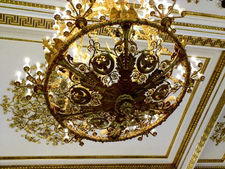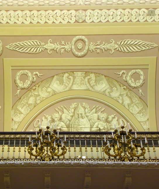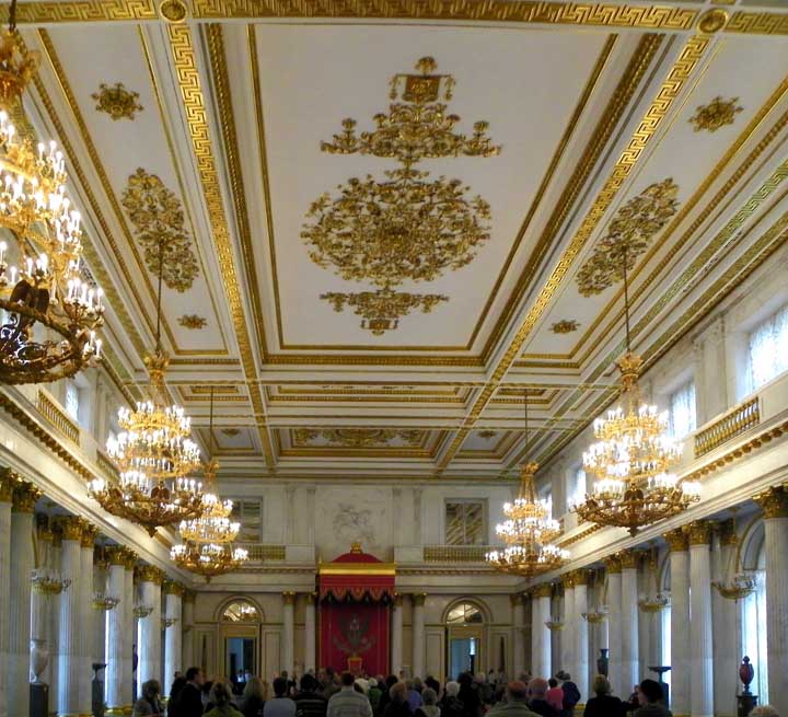 | Armorial Hall of the Winter Palace "The Armorial Hall of the Winter Palace was intended for grand receptions. It was created by Vasily Stasov in the late 1830s. The entrances to the hall are flanked by sculptural groups of early Russian warriors. Attached to the shafts of their banners were little shields bearing the arms of the Russian provinces, which gave the hall its name. "The slender columns supporting the balustraded gallery, the frieze with acanthus-leaf ornament and the overall combination of white and gold create an impression of majestic grandeur." - Hermitage Official Website ![]() Extensive gilding. ![]() Far left: Statues of warriors ![]() Gilded ....... Corinthian columns ![]() Gilding: Balustrade supported by modillions ..... Scroll acanthus leaves on frieze ..... Corinthian columns |