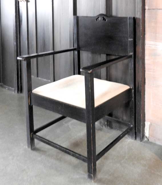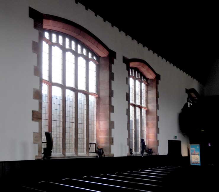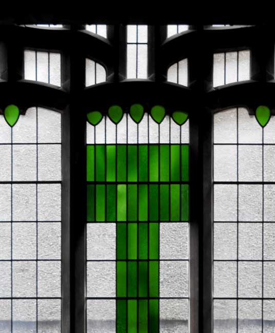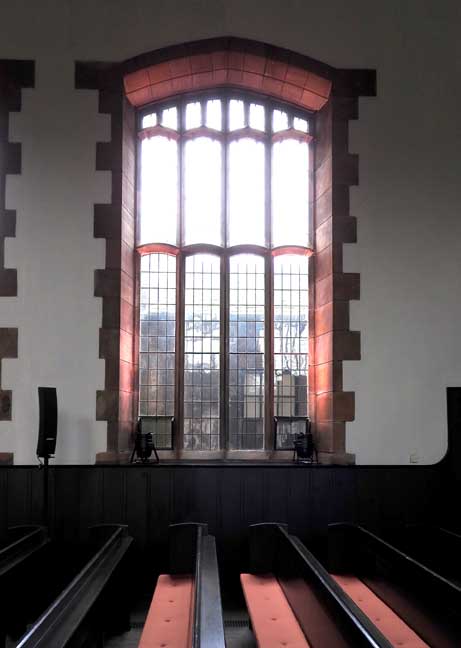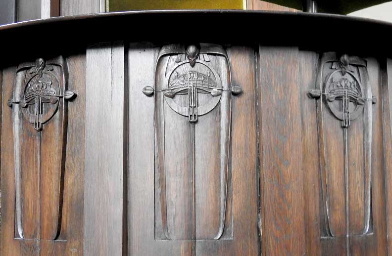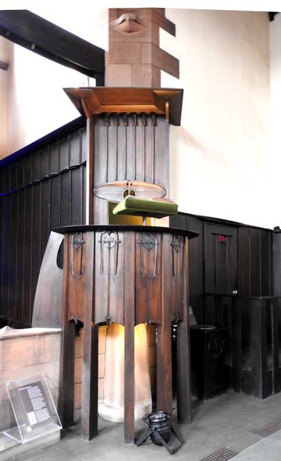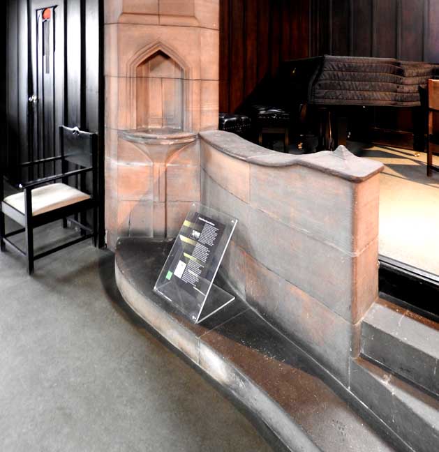 ![]() ![]() ![]() Communion table ![]() Oak pulpit ... Detail below: ![]() "... the oak pulpit, each facet of its curved front carved with bird and leaf (or tree) motifs." - - U. of Glasgow: "M125 Queen's Cross Church" (online April 2017) ![]() Canopied niche originally containing a basin for washing sacred vessels, often found near the altar in a medieval church ... Note Mackintosh-designed chair at left (detailed below:) ![]() Mackintosh-designed chair ![]() ![]() ![]() Stone quoins flank the upper windows ... Gallery ![]() ![]() Leaded glass windows ... Gibbs surround |