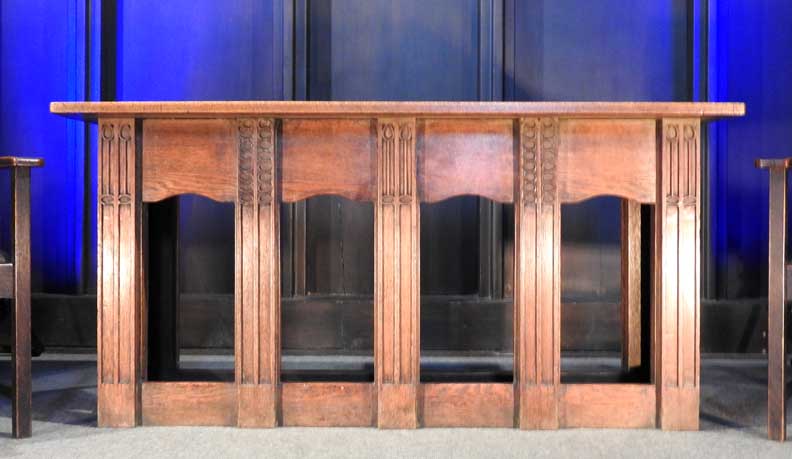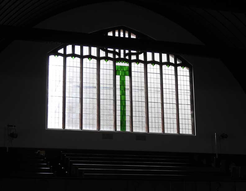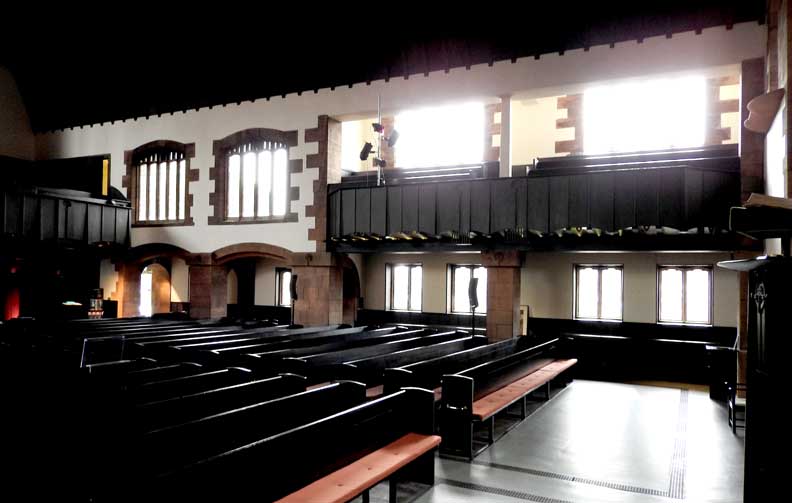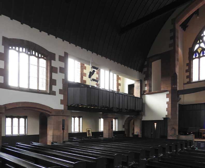 Interior ![]() Gallery at left ... Chanel with communion table in center ... Stone quoins around the chancel arch ![]() Blue heart window ![]() Wooden slightly pointed ceiling ... Two of four steel tie rods ... "At