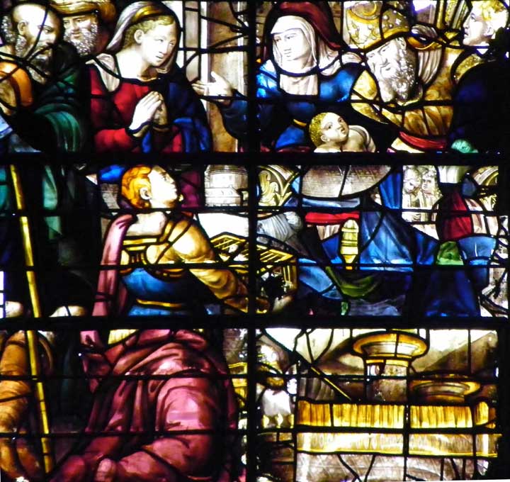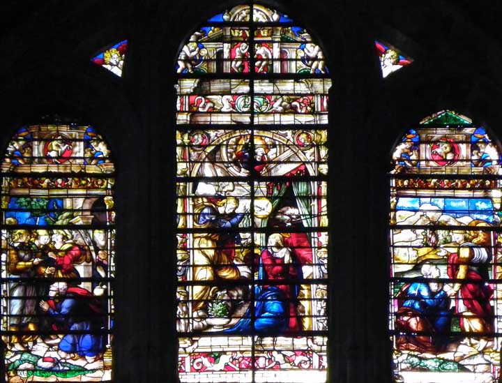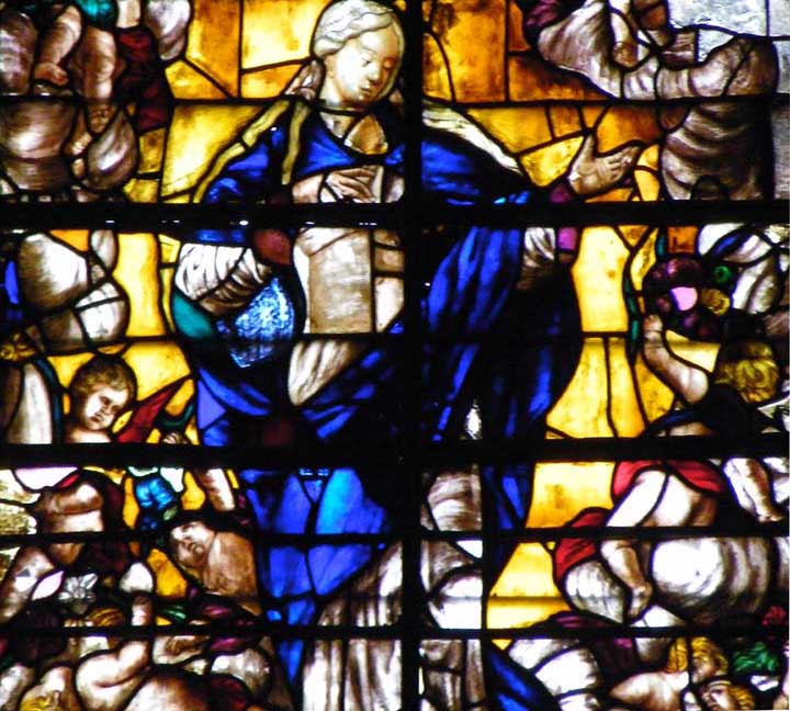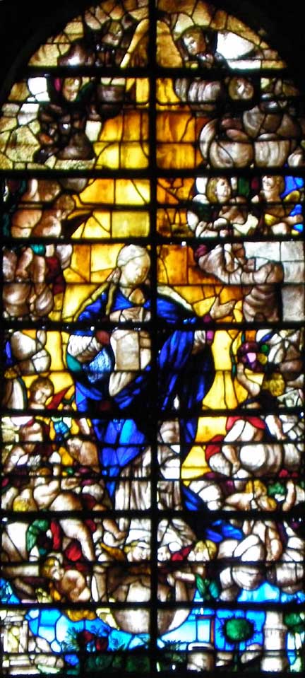 In wars and other catastrophes, buildings, including stained glass windows, are sometimes damaged. This window  has clearly been repaired with window pieces from other windows which were probably beyond repair.  This repair approach is now out of fashion.