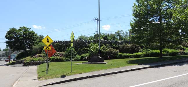The top of the rockwork was to form a "rustic walk and is to be laid out with seats and shade trees" widening at the eastern end to form a circular space thirty feet in diameter around a flagpole. The "retaining wall," as Olmsted termed the northern side of the rockwork where the land dropped precipitously, was to be one of unmortared fieldstones "with a considerable slope that its general aspect may be consistent with the rock elevation of the Memorial Hall grounds." Olmsted probably believed that this treatment of the northern flank of the rockwork would have two important results: it would knit together visually the rockwork and the Memorial Hall site and it would reinforce by its similar appearance the rugged power of the hall's surroundings. The "retaining wall" was to be three feet higher than the larger (and lower) terrace of the hall stairway, thus, in Olmsted's words, "forming a parapet in front of it," and, consequently, increasingly obscuring a full view of the hall, picturesquely framed by trees and by the boulders of the northern wall of the rockwork. The remainder of Olmsted's specifications was a demonstration of the historically ancient and symbolic meanings of the form of the rockwork and an argument for how well suited it was in consequence for a Civil War memorial for North Easton. (Brown, Robert F. "The Aesthetic Transformation of an Industrial Community." Winterthur Portfolio 12. University of Virginia Press. Charlottesville, Va. 1977. p. 204) |