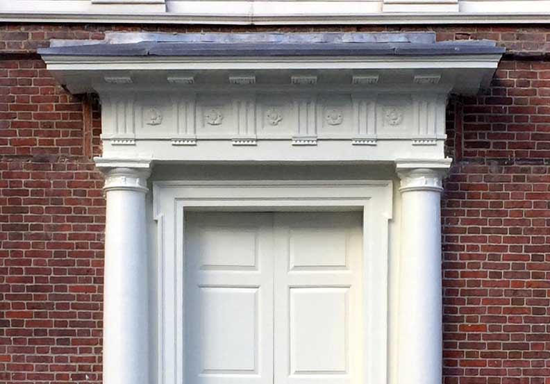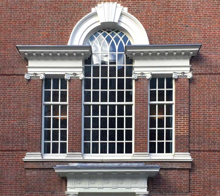 ![]() Style: Georgian Neoclassical ... Built: 1732-1748 ... Arhitect: Master builder Edmund Woolley Steeple ![]() Palladian window ... Doric order ![]() Palladian window ![]() Mutules beneath cornice ... Triglyphs alternating with rosettes ... Guttae beneath triglyphs ... Shoulders at top of door surround |