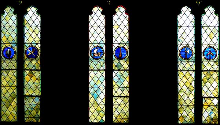 ![]() Diamond shaped quarries are opalescent glass. Roundels are enameled. ![]() |