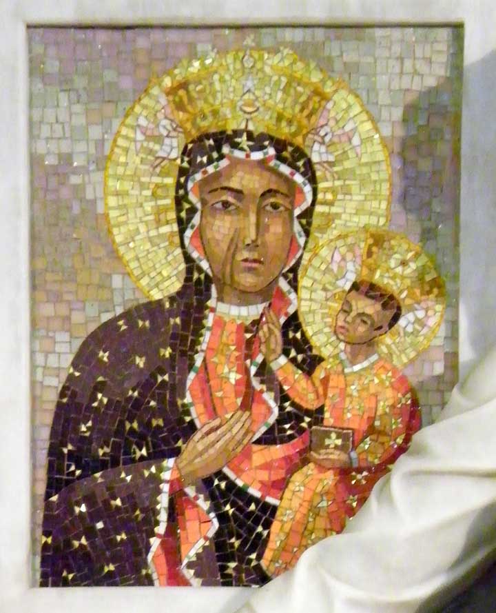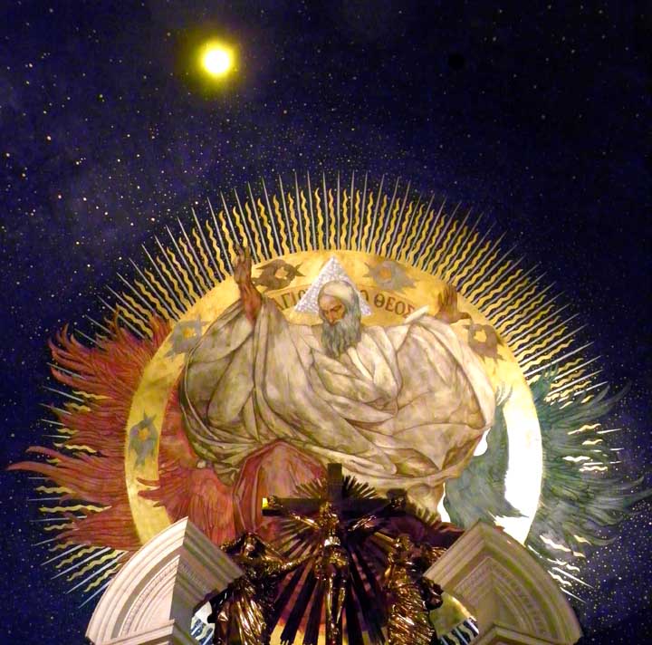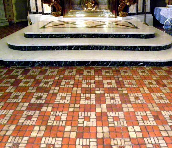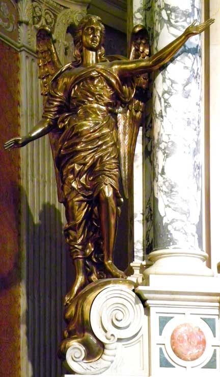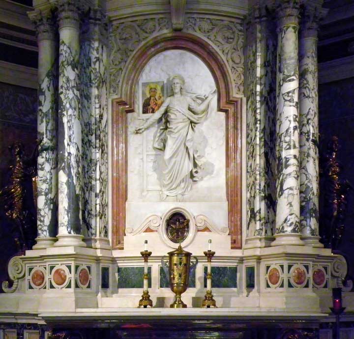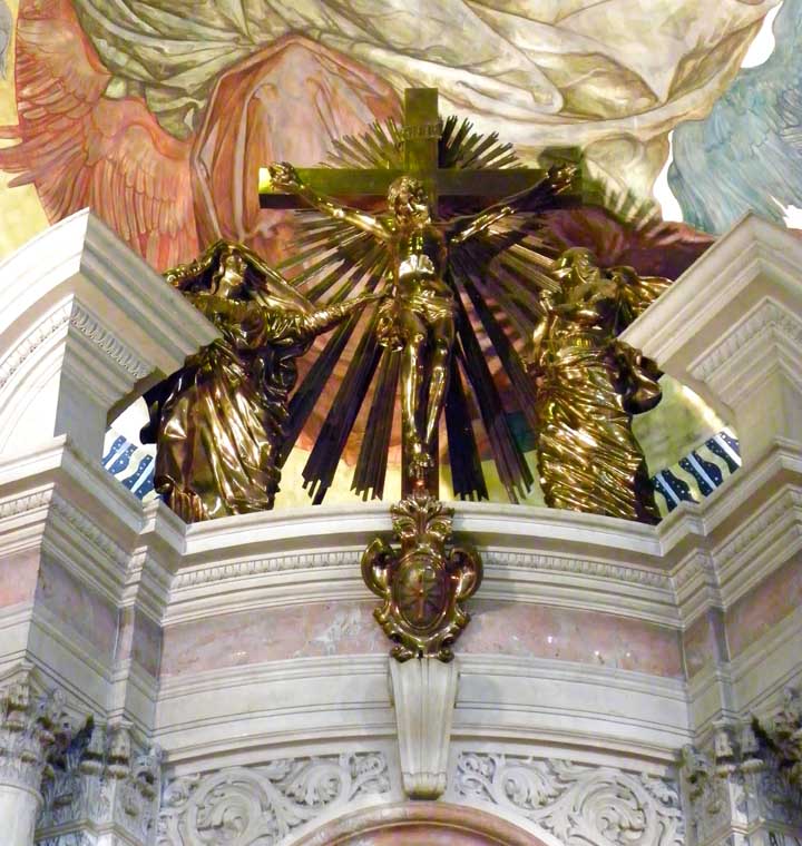 ![]() The wings at the top of the photo represent angels. Note the triangle behind the figure's head: this symbolizes the Trinity. ![]() God the Son, Jesus, is depicted crucified. PX on the cartouche is a symbol for Jesus. Below the cartouche is a marble keystone. ![]() ![]() Mosaic: Mary and Jesus ![]() Angel standing on marble scroll buttress. ![]() ![]() Tabernacle and candlesticks ![]() The dove represents the Holy Spirit, a member of the Trinity. Note marble scroll buttresses. ![]() Scroll buttress ![]() ![]() After Vatican II, Catholic priests faced the congregation while celebrating Mass; as a result, many churches added a second altar like this one. ![]() |