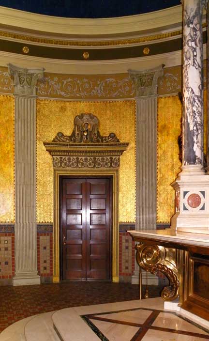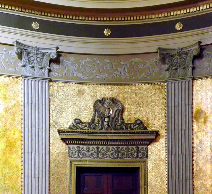 2010 Photos Paneled door and surround ![]() Details below: ![]() Top: Dentil molding 3 rosettes below the dentils. Scrolling acanthus leaves behind the Corinthian capitals atop fluted pilasters. ![]() Scrolling acanthus leaves behind the Corinthian capitals atop fluted pilasters. Capital details, from the top: Fleuron ..... Egg-and-dart molding ..... Bead-and-reel molding .... Scrolling acanthus leaves with hanging grapes ..... Volutes decorated with acanthus leaves ..... Bottom row of acanthus leaves. ![]() Medallion flanked by acanthus leaves depicts priest with chalice and candle and palm leaf. Stenciled wall. ![]() Egg-and-dart molding (top). Dentil molding Scrolling acanthus leaves. Leaf-and-dart molding. Bead-and-reel molding |