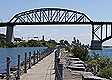Tall structure at in the middle of the photo supports power lines that span the Niagara River and are supported by an identical structure in Buffalo. |