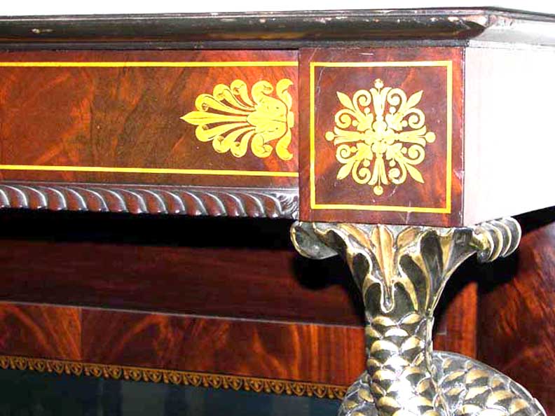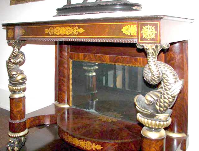 Pier/console table ... Frieze with gilded floral design on corner blocks ... Dolphins / veneered columns support table top