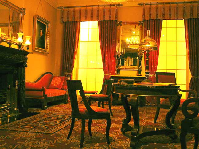 Drapes: The drapery arrangement, with an unusual bullion fringe valance, follows a design published in J. C. Loudon's Encyclopedia (London, 1834), a household manual favored in both England and America.
