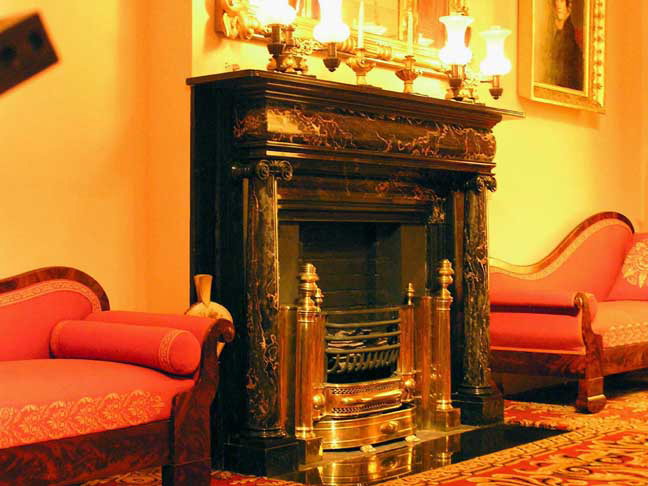 Fireplace: The black marble fireplace is of a type common to New York City interiors of the period. It was found at Halsted, a Greek Revival house built in Rye, New York, in about 1825.