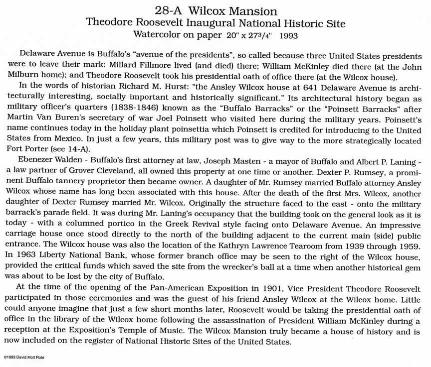 Links on Buffalo Architecture and History website: Wilcox Mansion / Theodore Roosevelt Inaugural National Historic Site Millard Fillmore William McKinley John Milburn Theodore Roosevelt Ebenezer Walden Joseph Masten Dexter P. Rumsey Portico Greek Revival style Pan- American Exposition Temple of Music