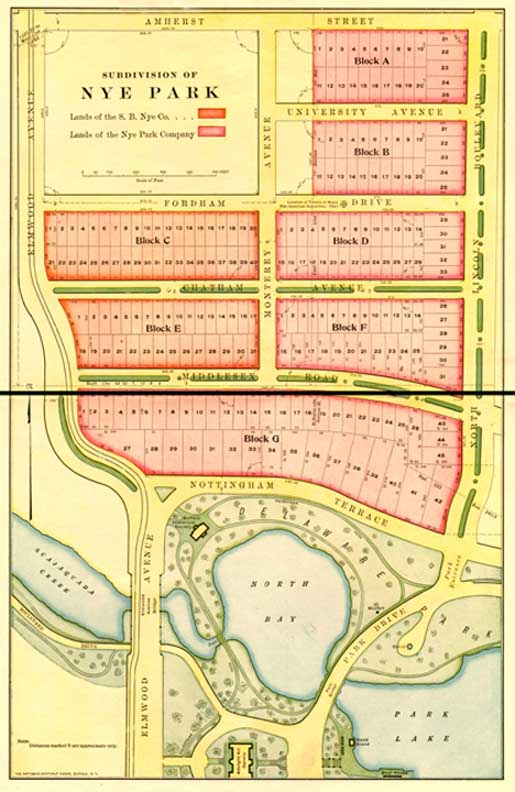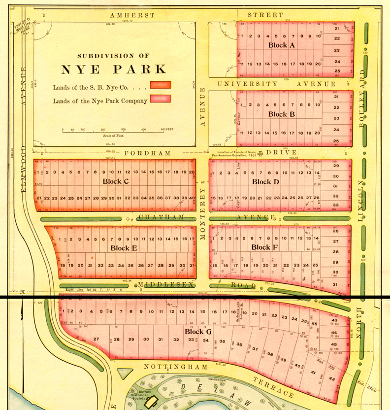 the Pan American Exposition, 1901. - The property contains nearly 50 acres, bordering on the north bounds of Delaware Park, a pleasure ground of 362 acres in extent with the magnificent Gala Water covering nearly 50 acres, thus giving the land of the Company AN OUTLOOK OF SCENERY unsurpassed. The beauty of this section was admired and commented upon by the many thousands who visited in 1901 the Pan-American Exposition - Neighbors: Albright Art Gallery, Buffalo Historical Society - North Lincoln Boulevard (future Lincoln Parkway) is 120 feet in width, and leads directly from the statue of David, just north of Gala Water (future Delaware Lake, then Hoyt Lake) - Lincoln Parkway, which the main approach to this beautiful section, will extended along the easterly line of this property under name of North Lincoln Boulevard. - 1909 transportation: Elmwood car line - Buffalo is a large City at the present time ... Lying as it does, at foot of the Great Lakes, it has a commanding position in commerce, and to-day is the largest port on the Lakes, and one of the important ports in the world. Its situation, midway between immense coal and iron deposits and adjacent to the unlimited electrical power from the Falls of Niagara, twenty miles to the north, gives it unparalleled advantages for the manufacturers steel, iron, and allied products and makes it one of the most important railroad centers of this country. |