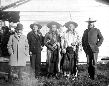 Summary: William Frederick "Buffalo Bill" Cody stands in the left center of a group of Native American chiefs. The group includes, from left, Brave Chief, Eagle Chief, Knife Chief, Young Chief, Buffalo Bill, American Horse, Rocky Bear, Flys Above and Long Wolf.